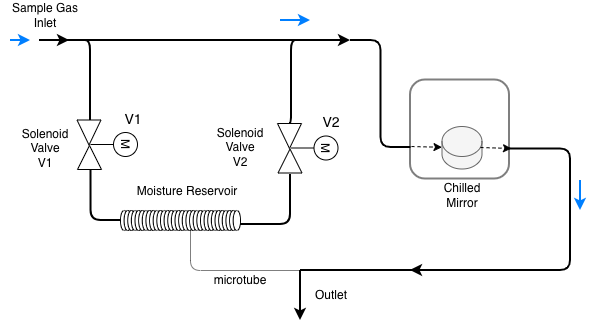 Figure 1. Conceptual schematic of an auxiliary humidification system in a chilled mirror dew point hygrometer showing the sample gas flow path, solenoid valves, and humidification tube.